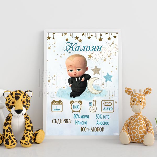 Открийте уникалния начин да запазите най-ценните спомени с нашия постер бебешка визитка с данните на детето. Персонализираният постер е идеален за всяко новородено, представяйки всички важни детайли, които ще направят първите му дни незабравими. Създайте незабравим спомен за вас и вашето бебе!