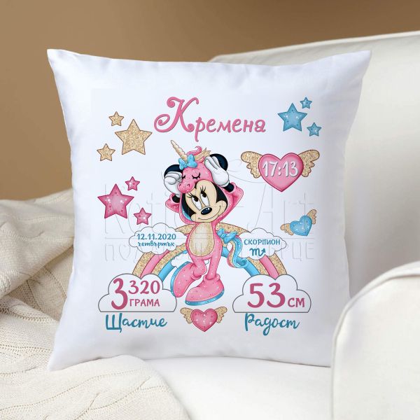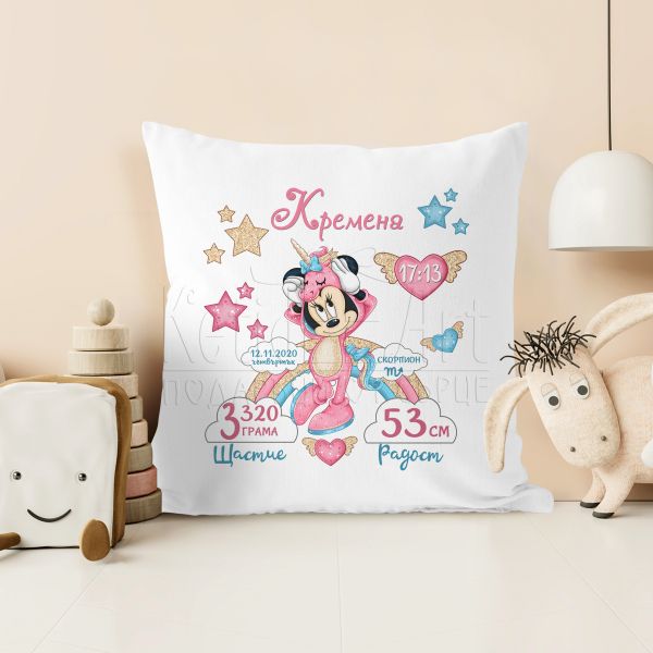 Нашата бебешка възглавница не е само практичен аксесоар, но и стилен елемент за детската стая. С персонализирания дизайн, който включва името и данните на бебето, тази възглавница се превръща в уникален акцент, който допълва всеки интериор и придава индивидуалност на детската стая.