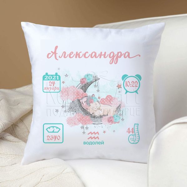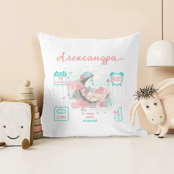 Уникален спомен, който остава за цел живот. Нашата персонализирана бебешка възглавница визитка е създадена, за да запечати най-важните данни от рождението на малкото съкровище - дата на раждане, име, час, тегло и височина. Това е повече от просто възглавница, това е спомен, който ще израства със семейството и ще им напомня за тези сладки моменти през годините.