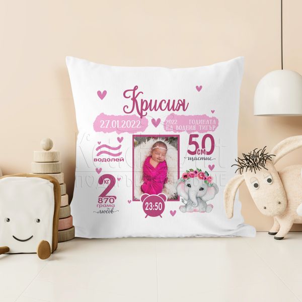 Нашата бебешка възглавница не е само практичен аксесоар, но и стилен елемент за детската стая. С персонализирания дизайн, който включва името и данните на бебето, тази възглавница се превръща в уникален акцент, който допълва всеки интериор и придава индивидуалност на детската стая.