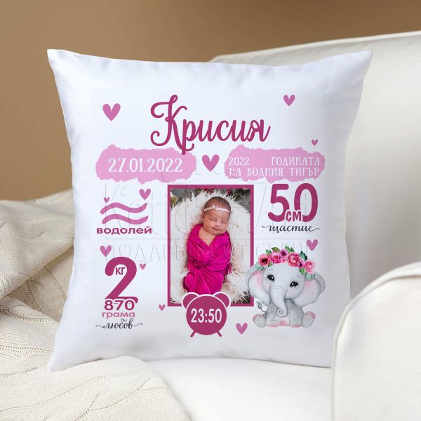 Уникален спомен, който остава за цел живот. Нашата персонализирана бебешка възглавница визитка е създадена, за да запечати най-важните данни от рождението на малкото съкровище - дата на раждане, име, час, тегло и височина. Това е повече от просто възглавница, това е спомен, който ще израства със семейството и ще им напомня за тези сладки моменти през годините.