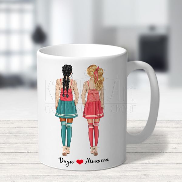 Красиво илюстрираният дизайн на две сестри с послание "Най-добрата сестра!" прави чашата невероятно уникална. Всяка глътка от нея носи радост и топлина на притежателя. Нейният невероятен дизайн, украсена с вашето име или името на вашата сестра, я прави уникално лична и неповторима. Всеки ден, когато отпивате глътка кафе или чай, ще се почувствате специални.
