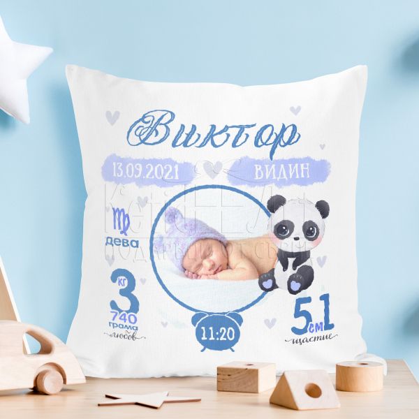 Уникален спомен, който остава за цел живот. Нашата персонализирана бебешка възглавница визитка е създадена, за да запечати най-важните данни от рождението на малкото съкровище - дата на раждане, име, час, тегло и височина. Това е повече от просто възглавница, това е спомен, който ще израства със семейството и ще им напомня за тези сладки моменти през годините.