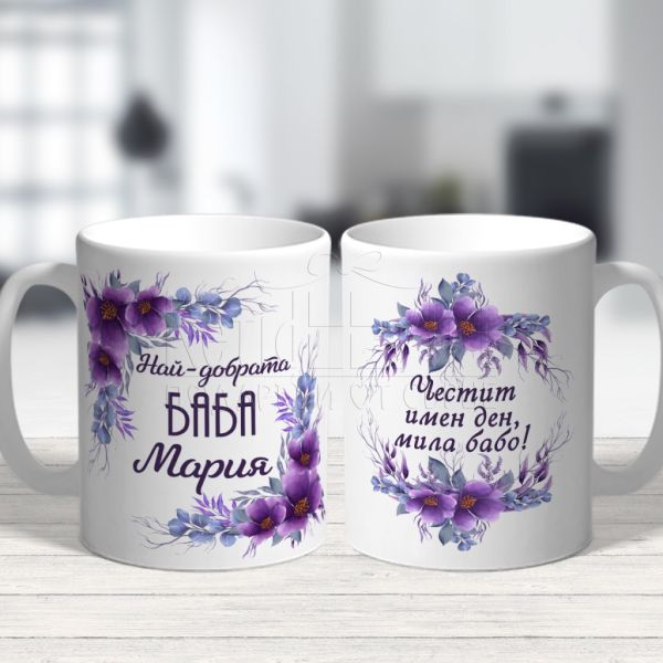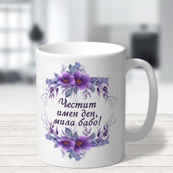 Красиво илюстрираният дизайн с послание „Честит имен ден, мила бабо!“ прави чашата невероятно уникална. Всяка глътка от нея носи радост и топлина на притежателя. Нейният невероятен дизайн, украсена с името и, я прави уникално лична и неповторима. Всеки ден, когато отпива глътка кафе или чай, ще се почувства специална.