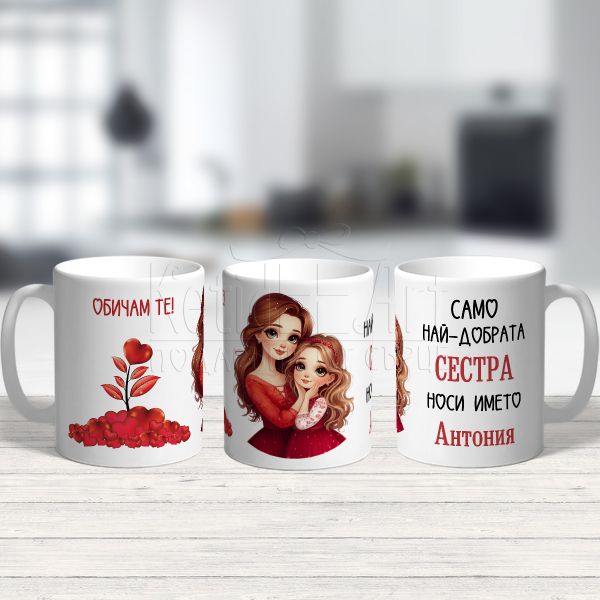 Красиво илюстрираният дизайн на две сестри с послание "Само най-добрата сестра носи името Антония! " прави чашата невероятно уникална. Всяка глътка от нея носи радост и топлина на притежателя. Нейният невероятен дизайн, украсена с вашето име или името на ваш близък, я прави уникално лична и неповторима. Всеки ден, когато отпивате глътка кафе или чай, ще се почувствате специални.