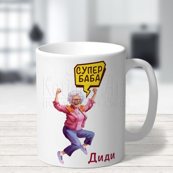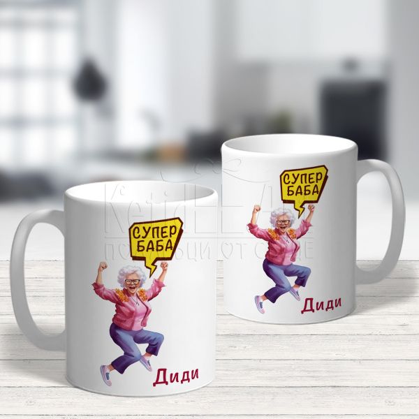 Красиво илюстрираният дизайн с послание "Супер баба!" прави чашата невероятно уникална. Всяка глътка от нея носи радост и топлина на притежателя. Нейният невероятен дизайн, украсена с името и, я прави уникално лична и неповторима. Всеки ден, когато отпива глътка кафе или чай, ще се почувства специална.