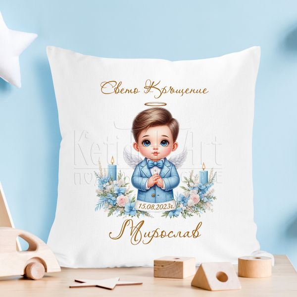 Възглавницата за кръщене е изработена с внимание към детайлите и с нежни декорации, които придават особено усещане на този особен момент. Възможността за персонализация с име, дата и символи на кръщението я прави още по-специална и запомняща се за специалния ден на кръщенето.