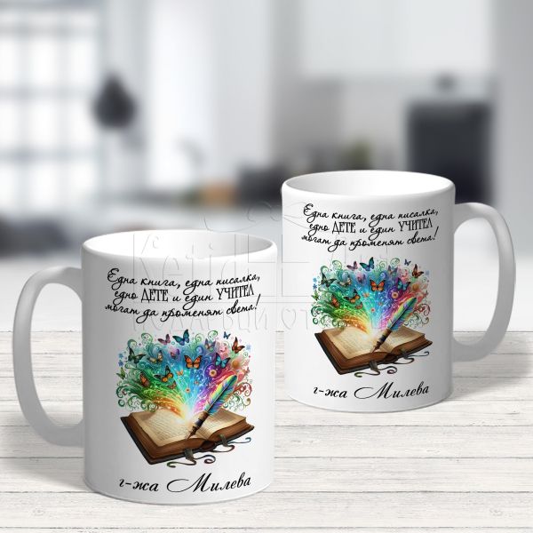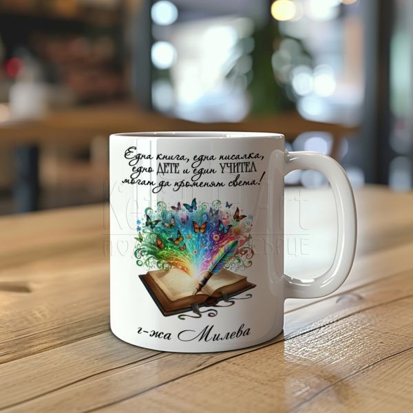Красиво илюстрираният дизайн, които празнуват прави чашата невероятно уникална. Всяка глътка от нея носи радост и топлина на притежателя. Нейният невероятен дизайн, украсена с вашето име или името на вашата учителка, я прави уникално лична и неповторима. Всеки ден, когато отпивате глътка кафе или чай, ще се почувствате специални.