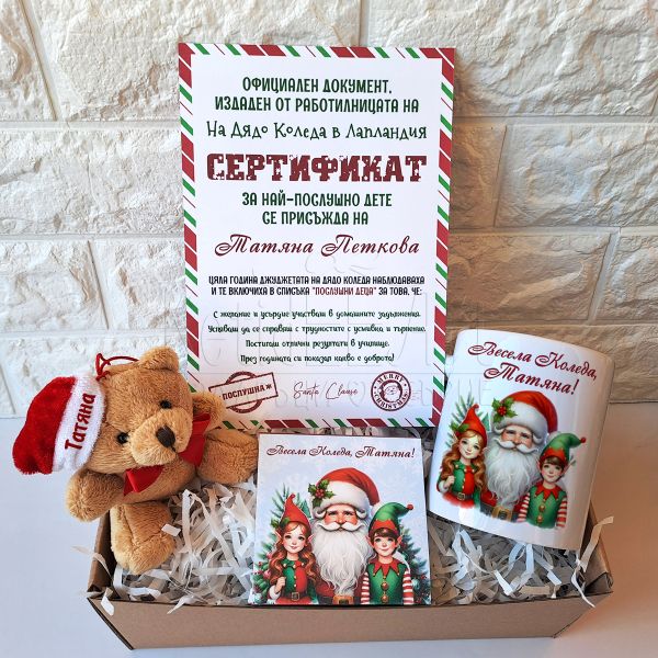 - Коледно мече с име – меко и пухкаво мече, което носи името на детето. Перфектно за гушкане и игра, то се превръща в мил приятел, който ще носи радост дълго след празниците.