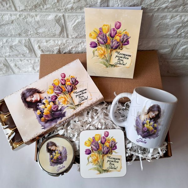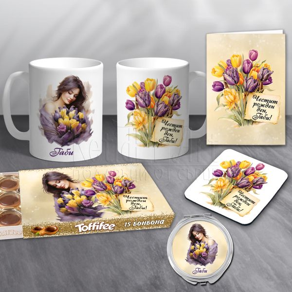 Комплектът включва изящна чаша, подложка за чаша, огледало, персонализирани бонбони Toffifee и картичка – всичко в една тема, която изразява красота и женственост чрез дизайн с жена, прегърнала букет лалета.