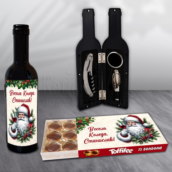 Този комплект предлага комбинация от елегантни вино аксесоари и персонализирани сладки изкушения, създаден да донесе радост и изискано преживяване.