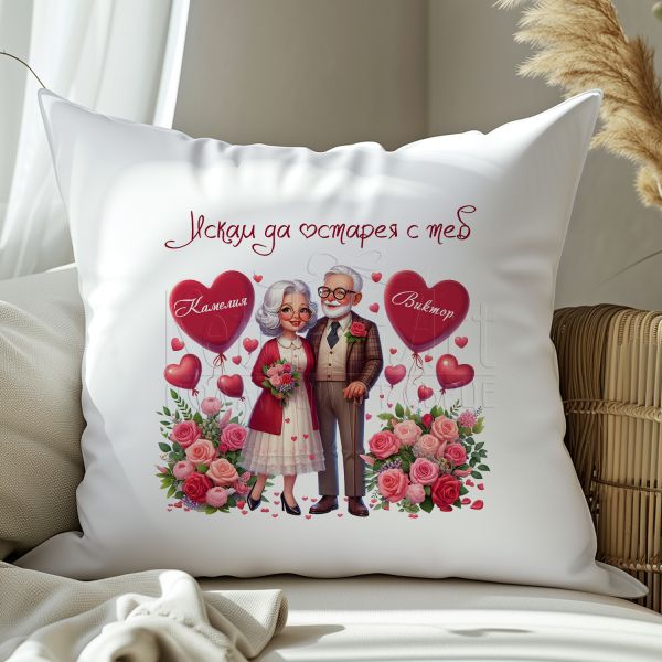Красиво илюстрираният дизайн с послание "Искам да остарея с теб!" прави възглавницата невероятно уникална и неповторима. Този дизайн съчетава чувственост и изящество, предавайки вашите чувства по най-красив начин.